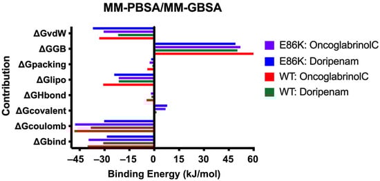 One-to-one energy components such as van der Walls forces, coulomb charges, and H-bonds are computed using MM-PBSA and MM-GBSA tools in Gromacs v2020.4 (Figure 8). The MMPBSA and GBSA tools have also been recently developed using machine learning algorithms for the better identification of local contacts. Also, Supplementary Table S2 represents these values and is incorporated in the text for understanding. The WT–OncoglabrinolC complex shows the maximum Gibbs free energy (−40.2 kJ/mol). When the glutamic acid is mutated to lysine (E86K), the Gibbs free energy does not change drastically, showing a similar affinity of OncoglabrinolC towards the protein. It suggests that after dynamic simulation, OncoglabrinolC is the most preferred molecule and a potential lead; it shows worthy interaction with aacA7 protein, demonstrating its potential as a lead candidate in the future.