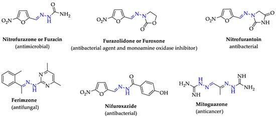The pharmacological activity of hydrazide hydrazone derivatives is attributed to their azomethine group (-NH–N=CH-), which makes them important families in organic chemistry [4,5,6,7,8,9,10]. A wide range of pharmacological characteristics, including antibacterial, antifungal, antitubercular, and antioxidant activities, are known for this family [11,12]. According to a recent publication, 3-hydroxy-2-naphthohydrazide hydrazones have significant antiproliferative effects in human cancer cell lines [13], and 2-hydroxy-4-iodobenzohydrazide hydrazones have potent bactericidal effects on certain cocci and bacilli [14]. It was reported that hydrazide–hydrazones had notable antibacterial effects and, in some cases, much greater activity than reference drugs. They have the potential to affect the strength of the cell wall and cell membrane of microbial cells [15,16,17,18,19]. Certain medications that have hydrazide–hydrazone/hydrazone moieties, such as nitrofurazone, furazolidone, and nitrofurantoin, are depicted in Figure 1.