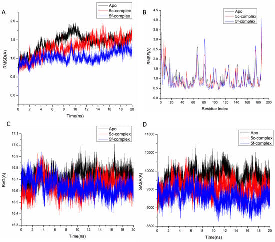 In this work, the stability of the systems was evaluated during 20 ns simulations using the root mean square deviation (RMSD). The average recorded RMSD values for the full frames of the systems were 1.41 ± 0.23 Å, 1.27 ± 0.25 Å, and 1.03 ± 0.13 Å for the apo-, 5f- and 5c-complex systems, respectively (Figure 2A).