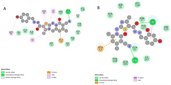 The residues of the interaction of compounds 5c (A) and 5f (B) in the catalytic site of the DNA gyrase receptor.