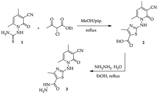 The synthesis of the new ester 2 and hydrazide 3 is depicted in Scheme 1. Ethyl thiazole-5-carboxylate 2 was produced with excellent yield when thiourea derivative 1 [33] was treated with ethyl 2-chloro-3-oxobutanoate in MeOH with piperidine at reflux. To obtain the corresponding hydrazide 3 with a good yield, ester 2 was treated with hydrazine monohydrate in EtOH at reflux. The spectroscopic data clarified the structures of compounds 2 and 3. The IR spectrum of 2 showed absorption bands at 3408, 2222, 1711, and 1653 cm−1 due to the NH; CN; C=O, ester; and C=O, cyclic amide, respectively. Due to the presence of three Me, a pyridine-H5, and an exchangeable NH group, the 1H NMR spectrum revealed five singlet signals at δ 2.20, 2.36, 2.40, 6.34, and 10.16 ppm. Furthermore, the ethyl group was identified as the source of triplet and quartet signals, which were found at δ 1.21 and 4.17 ppm, respectively. The most significant peaks in the 13C NMR spectrum were at δ 14.2 (Me), 18.6 (Me), 19.2 (Me), 20.7 (Me), 60.6 (CH2), 115.7 (CN), 159.9 (CO, cyclic amide), and 185.6 (CO, ester). The [M+, 30%] ion peak was visible in the mass spectrum at 332. The spectra of hydrazide 3 revealed three bands at 3407–3376, 3334, and 1643 cm−1 (IR); two singlet signals at δ 4.1 and 7.15 ppm (1H NMR); and 162 ppm (13C NMR) due to the hydrazide moiety (CONHNH2).