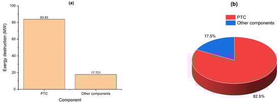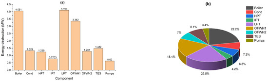 Differences in exergy destruction among solar and other system components: (a) exergy destruction in MW and (b) exergy destruction percentage.