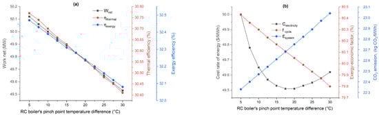 Proposed system’s performance, economic cost, and environmental impact relative to the RC boiler’s pinch point temperature difference: (a) net power output and efficiencies and (b) economic cost and environmental impact.