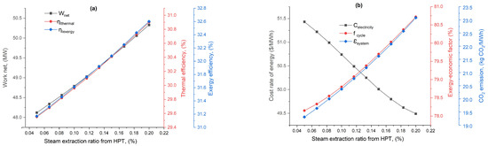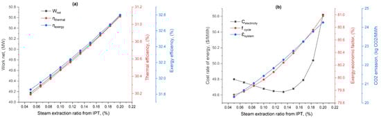 Proposed system’s performance, economic cost, and environmental impact as a function of LPT extraction ratio: (a) net power output and efficiencies and (b) economic cost and environmental impact.