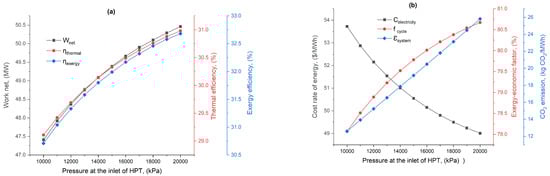 Proposed system’s performance, economic cost, and environmental impact as a function of pressure at the beginning of HPT: (a) net power output and efficiencies and (b) economic cost and environmental impact.