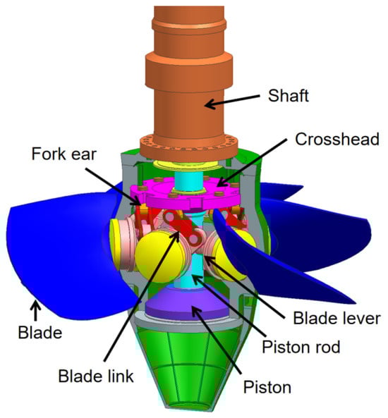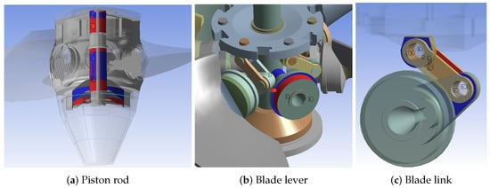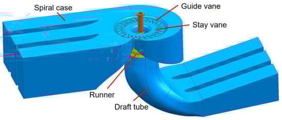 In this article, a computational fluid dynamics (CFD) model is used to calculate the full flow of a Kaplan turbine, and then a finite element model (FEM) is used to calculate the structural field of the Kaplan turbine. The entire computational flow field of a Kaplan turbine includes the spiral case, guide vanes, stay vanes, runner, and draft tube, as shown in Figure 1. The solid part of the Kaplan turbine consists of blades, a runner body, blade levers, blade links, bolts, a piston rod, and others, as shown in Figure 2.