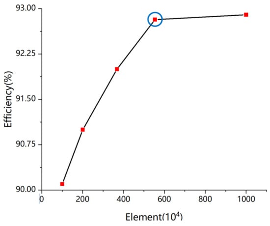 The fluid domain in this article is mainly divided into tetrahedral elements with good adaptability. Due to the significant impact of the number of meshes on the accuracy of calculation results, the efficiency of Kaplan turbines under rated operating conditions is used to verify the independence of flow field meshes. Comparing the calculation results of different sets of meshes with experimental values, the verification results of grid independence are shown in Figure 3. When the number of mesh nodes is less than 5.54 million, the efficiency shows a clear upward trend. When the total number of mesh nodes exceeds 5.54 million, the calculated efficiency remains basically unchanged, and the difference between the calculated efficiency of 92.9% and the experimental efficiency of 93.1% is small. On the premise of ensuring the cost and accuracy of the calculation, the set of 5.54 million meshes is selected for this calculation, as shown in Figure 4. The number of meshes for different fluid domains is shown in Table 2.