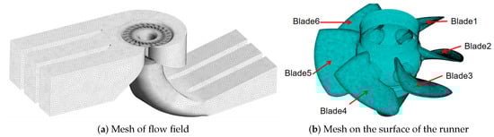 In this article, the transient flow characteristics of the flow field were obtained through commercial ANSYS 19.1 CFX and then imported into ANSYS APDL 19.1 to obtain the dynamic response characteristics of the runner structure. In the calculation of flow fields, the Reynolds-averaged Navier–Stokes (RANS) equation is mainly used []. The turbulence model is the SST model, which has high accuracy in calculating turbulent shear stress and can effectively predict the size of the separation zone at the separation point under a reverse pressure gradient []. In this fluid calculation, the rated head of the Kaplan turbine is 25 m, the inlet of the spiral case is set as a full-pressure inlet, and the outlet of the draft tube is set as a static pressure outlet. The rotational speed of the runner domain is set to 68.2 r/min, while the other fluid domains are set to static. All walls are set to no-slip. The time step is set to 1/126 of the rotation period. The parameters are shown in the Table 1 below.