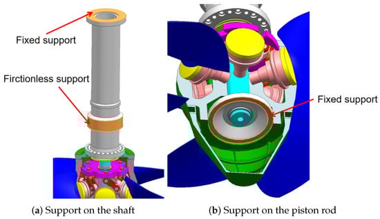 The solid domain model of the runner is divided into ANSYS Mesh. Hexahedral mesh is used on the shaft, while tetrahedral mesh is used on structures such as blades, a piston, and a crosshead. For the verification of mesh independence in the solid domain, the maximum stress of blades with different mesh numbers is calculated in this paper. When the number of runner elements is 1.55 million, the maximum stress on the blade is 149 MPa, which is only 0.5% different from that of the 2.34 million mesh elements. Therefore, the solid domain is divided into 1.55 million elements. The boundary conditions for the runner are set according to the actual situation. As is shown in Figure 5. Fixed support is applied to the upper surface of the shaft and the lower surface of the piston rod, and the interface between the shaft and the thrust bearing is set as a frictionless interface. The interaction surface between the blades and the flow is set as the fluid–structure coupling surface. In this study, the main focus is on analyzing the impact of the unsteady characteristics of the flow field inside the Kaplan turbine on the key components of the turbine. The influence of blade deformation on the characteristic parameters and pressure pulsation characteristics of the internal flow field is limited, so the influence of blade deformation on the internal flow field is not considered. The unidirectional coupling method is adopted to calculate the dynamic stress characteristics of key components.