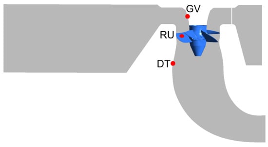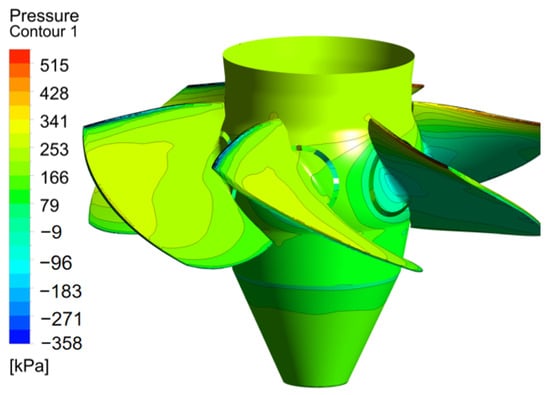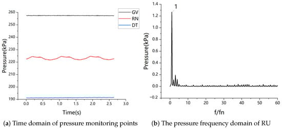 Pressure monitoring points are arranged on the wall surface of the vaneless area of the turbine, the pressure surface of the runner blades, and the wall surface of the draft tube. The positions of GV and DT are fixed, while RU rotates with the rotation of the blades. The monitoring point positions are shown in Figure 7. Figure 8 shows the the spectrum of RU and time-history results of pressure pulsation at GV1, RP1, and DT1. It can be seen that the pressure gradually decreases along the channel, and the pressure fluctuation value of RU is significantly greater than that of the other two points. Due to the rotation of the RU point with the runner, the main frequency of RU is 1fn, and its amplitude is 1.27 kPa. Figure 9 shows the pressure distribution on the surface of the runner blades. The leading edge of the blade pressure surface has a small range of low-pressure areas, while the leading edge of the blade suction surface has a small range of high-pressure areas.