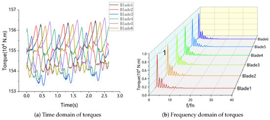 Figure 10a shows the time-domain of torque for six blades. It can be seen that the torque fluctuates periodically, and the maximum and minimum torque values of different blades are different. The torque difference between different blades at the same time is significant. Figure 10b shows the frequency domain of torque for six blades, with almost identical pulsation amplitudes for torque across different blades. The main frequency of torque for all blades is 1 fn, which is the same as the main frequency of pressure pulsation, with an amplitude of 0.94 × N·m. The torque of the runner blades around their own blade lever is ultimately transmitted to other components inside the runner through the blades. The unevenly distributed and constantly changing torque will ultimately have a significant impact on the fatigue of the runner components.