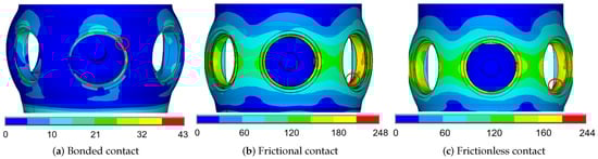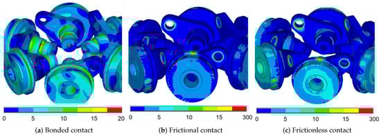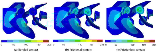Under fixed, frictional, and frictionless contact modes, the average stress of the blade is not significantly different, and the fluctuation amplitude is similar. But as the main force transmission component of the runner system, the blade lever has the highest average stress under frictional and frictionless contact conditions. Its maximum stress is between 305 MPa and 299 MPa, located at the junction of the blade lever and the hub. The blade lever stress under fixed contact mode is 19.6 MPa, which is much lower than that under the other two cases, located at the groove at the intersection of the blade lever and the inside of the runner body. Similar to the blade lever, the stress results of the runner body under the fixed contact condition are much smaller than those of frictional and frictionless contact, and its maximum stress is located at the junction of the blade and hub. The maximum stress position of the runner body under friction and frictionless contact is at the junction of the blade lever circumference surface and the hub of the runner body.