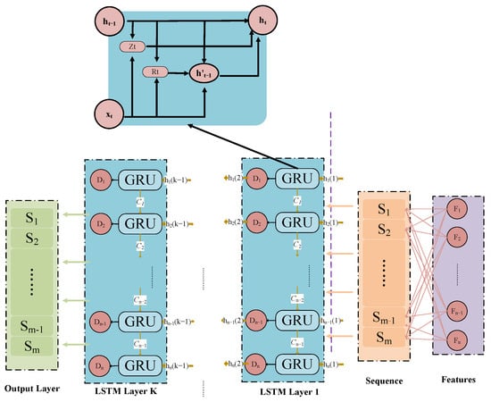 where represents the input at time step t; , , and are weight matrices specific to each gate; and sigmoid and tanh are activation functions. The GRU’s ability to selectively update and reset its hidden state allows it to capture long-range dependencies in sequential data while mitigating some of the vanishing gradient problems associated with traditional RNNs. This makes GRUs a popular choice for various sequential data tasks in deep learning [17]. The general structure of the GRU is shown in Figure 1.