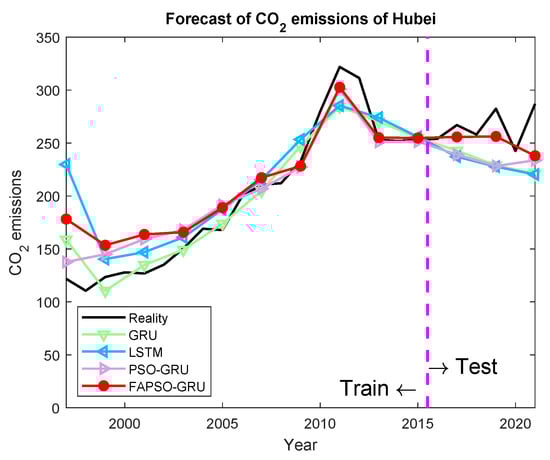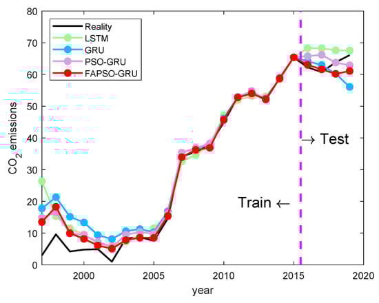 The results of the FAPSO-GRU and the control group on the test set and the error from the true value are shown in Table 2. Among these, the FAPSO-GRU exhibits the smallest prediction errors in 2016 and 2017 (1.21% and 1.40%, respectively). It is not as good as some of the control group algorithms in terms of prediction errors for 2018 and 2019.
