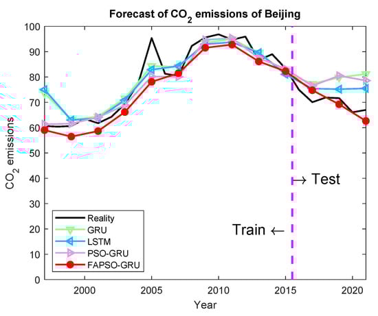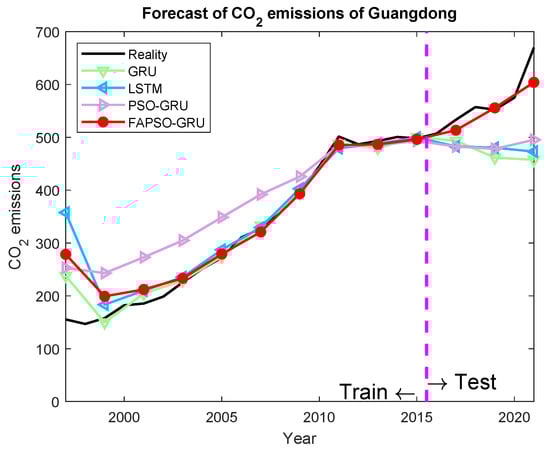 To verify the performance of FAPSO-GRU in predicting the total CO2 emissions in Hainan Province, we selected GRU, LSTM, and PSO-GRU as the control group of the experiment. As PSO is an optimizer, some of the parameters of PSO-GRU and FAPSO-GRU were different from GRU with LSTM. However, to ensure the fairness of the experiment, we made sure that the parameters were equal except for the optimization object parameter. The specific details of the parameters are shown in Table 1. Population size represents the number of particles involved in the evolution process, and the number of iterations indicates the number of times the algorithm iterates. To intuitively demonstrate the error between the prediction results and the true values of FAPSO-GRU and the control group in the training and test sets, we show the training and testing results for each algorithm as shown in Figure 3.