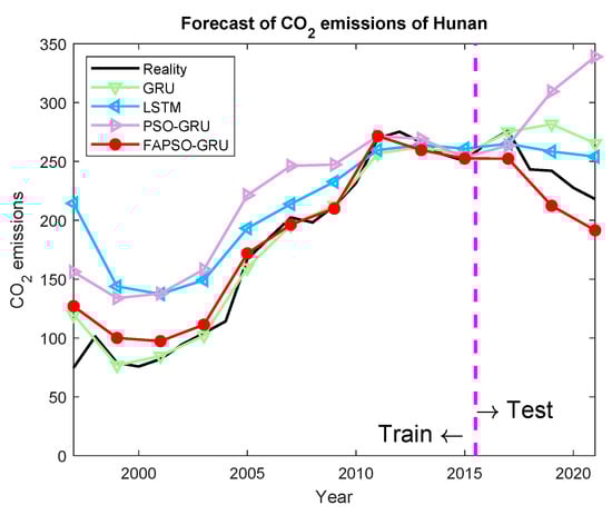 To evaluate the performance of our proposed model, we conducted experiments using real carbon emission data from Hainan Province, covering the period from 1991 to 2019. Specifically, data from 1991 to 2016 were used for training, while data from 2016 to 2019 were reserved for testing. Control groups included standard GRU models, standard LSTM models, and PSO-GRU models. When comparing FAPSO-GRU to the traditional GRU model, we observed substantial improvements: a 42.27% reduction in MAE, a 42.38% reduction in RMSE, and a 43.06% reduction in MAPE. To further validate the performance of FAPSO-GRU, additional experiments were conducted using data from Shanghai, Beijing, Guangdong, Hubei, and Hunan. The experimental results conclusively demonstrate that our proposed model provides a highly accurate solution for carbon emission prediction tasks.