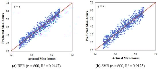 Figure 10 exhibits the scatter plots with actual man-hours in the x-axis and predicted man-hours in the y-axis from each model. The data for the prediction results come from the test set. The models predicted well as the points are located on or near the y = x line with similar actual and predicted values. However, the result of RFR in (a) shows that the R-square value is small compared to (b), (c) and (d). It indicates that the prediction result of RFR is much better than the other three models. It proves that RFR can be effectively applied to the prediction problem of man-hours while maintaining sufficient accuracy. Table 7 assesses the comparison of the prediction results by RFR, SVR, BPNN and LR. From reviewing the model prediction results, it is deemed that the RFR model would be a good choice for predicting man-hours in steel plants.