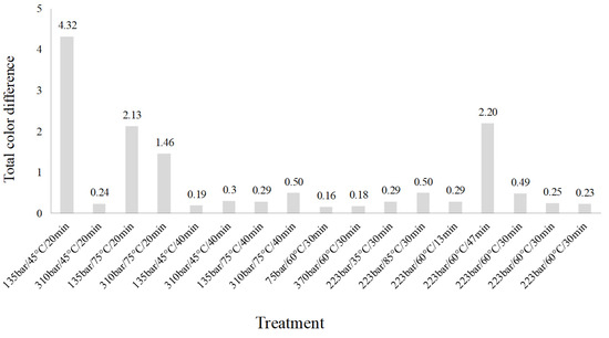 | 310 bar/45 °C/20 min | 93.03 ± 0.01 | 0.03 ± 0.00 | −4.97 ± 0.01 | 4.97 | 270.35 | ![]() | |