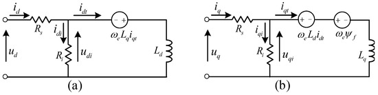 Equivalent circuit diagram of PMSM in the dq-axis coordinates: (a) Equivalent circuit diagram of PMSM under d-axis coordinates. (b) Equivalent circuit diagram of PMSM under q-axis coordinates.