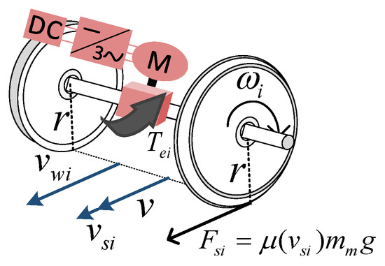 This paper only analyzes the longitudinal motion of the train because the lateral motion is not controlled by a power unit. The module depicted in Figure 2 consists of a power unit and a wheelset. For the i-th motor, the motor generates electromagnetic torque , which propels the wheelset and produces an angular velocity . Consequentially, the angular velocity of the wheelset results in a linear velocity at the outer edge of the wheelset, which differs from the train speed v. This difference is measured as the creep speed . The adhesion coefficient is a factor that depends on the creep speed. It is multiplied by the positive pressure of the train on the track to determine the traction force produced by this module. This traction force is also responsible for the actual load on the motor. The above process can be described as follows.