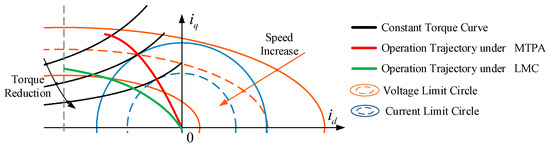 Schematic diagram of the operation trajectory of embedded PMSMs under different control strategies.