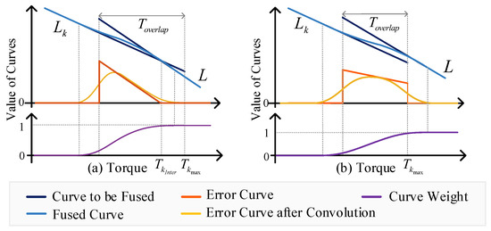 To provide a more precise depiction of the curve, a series of torque and currents data is obtained at uniform intervals spanning from 0 to the motor maximum output torque. The torque corresponding or value is denoted as . Figure 5 is a schematic diagram of curve convolution fusion, where curve L represents the originally fitted curve, and represents the newly fitted curve in the current period. The elucidation of the particular approach for implementation is provided as follows.
