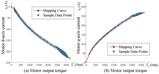 Based on the above discussion, this section proposes a two-stage motor loss estimation method that relies on a mechanistic model and incorporates real-time system sampling data. This method decouples motor loss estimation into two independent steps: estimating the dq-axis currents from the total demand torque, and then converting these currents into motor losses. The relationship between current and motor loss, as detailed in the previously mentioned drive system mechanistic model, maintains the direct influence of motor parameters on loss. Regarding current estimation, due to the variety of motor control methods, it is difficult to immediately derive explicit expressions from the mechanistic model. Therefore, a data-based approach to identify the dynamic torque–current mapping curves is adopted in this paper. Given the motor’s low rotational inertia and high response speed, this paper has decided to disregard the impact of system inertia. Instead, real-time sampling data are used directly to construct dynamic torque–current mapping curves, accurately depicting the relationship between torque and current under current operating conditions [24].
