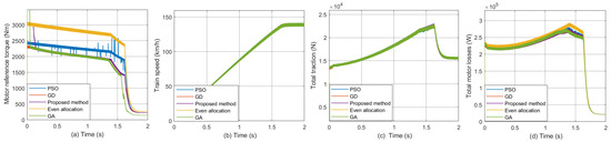 At an iteration frequency of 1 kHz, the control distribution coefficient is updated every 0.1s using the classic GD, PSO, and GA methods. Figure 11 illustrates the alterations in motor reference torque, total motor losses, train speed, and total train traction force when different methods are used in traction and constant speed conditions. The distribution coefficients of the four groups of motors in this process are depicted in Figure 12. Several conclusions can be drawn, as follows:
