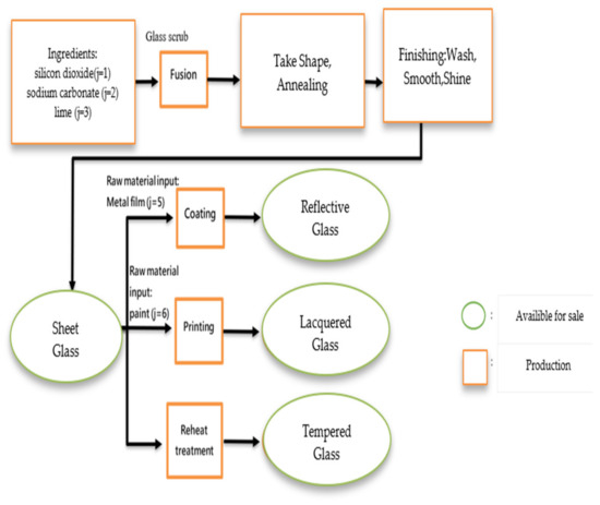 | j | Types of Raw Materials Used: We categorize raw materials into seven types, labeled 1 through 7, with each type representing a different material such as silicon dioxide, sodium carbonate, lime, petroleum coke, metal film, paint, and waste glass. |