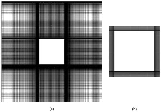Computational grid; (a) Solution domain; (b) Grid in the vicinity of the square block.