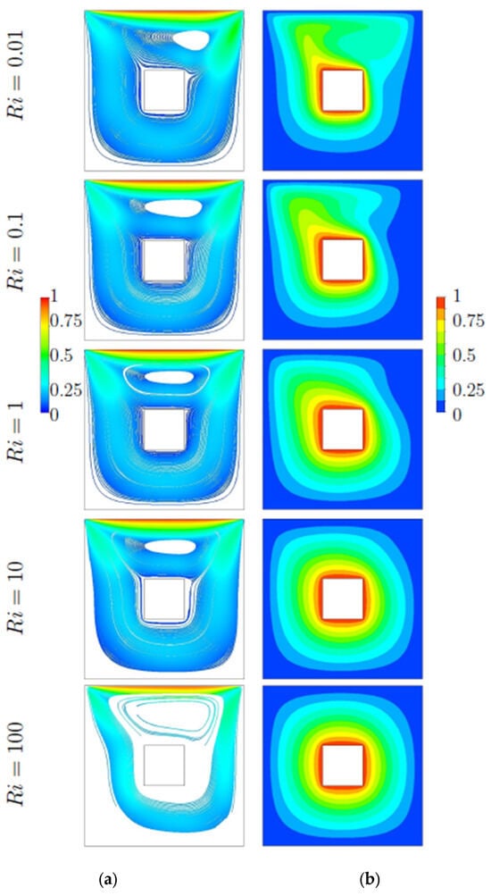 Figure 3a,b illustrates the streamlines and isotherms for a range of Richardson numbers (Ri) from 0.01 to 100, considering a nanofluid with a volume fraction (ϕ) of 0.04. In all cases, a single clockwise cell is observed. The nanofluid located over the left upper corner is pulled upwards towards the top lid and circulates due to the shear force exerted by the moving top lid. For Ri = 0.01, a single cell appears over the right top corner of the blockage. As the Richardson number increases, the cells grow in size until Ri = 10, and the center of the cell moves over the blockage. At Ri = 100, the cell further expands. The rightward movement of the lid leads to the formation of steep velocity gradients near the top lid. Throughout all cases, there exists a gap between the blockage and the left-right and lower walls of the cavity. This gap tends to widen as the Richardson number increases. Consequently, as the Richardson number increases, there is minimal flow over the blockage surfaces. The isotherms provide insights into the influence of the Richardson number within the cavity. Temperature gradients are more pronounced near the blockage surfaces. For lower Richardson number values, the movement of the top lid affects the blockage, resulting in a temperature gradient over the left top corner of the blockage, which is observed up to Ri = 1. However, for Ri = 10–100, the effect of natural convection becomes dominant over forced convection, and only a temperature gradient is observed around the blockage.