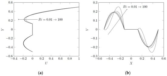 Figure 4a,b illustrates the velocity profiles for U-velocity and V-velocity along the horizontal and vertical midplane within the cavity. The U-velocity profiles exhibit similar characteristics, but the position of the bubble influences the U-velocity values. Between the blockage and the top lid, the U-velocity values initiate at the lid velocity, reach a minimum, and then increase to zero at the blockage surface. In the lower space between the blockage and the bottom wall of the cavity, the U-velocity values are negative due to the clockwise stream and remain nearly constant for all Richardson number values. On the other hand, the V-velocity values are positive due to the upward flow between the left wall and the blockage, and negative due to the downward flow between the right wall and the blockage. As the Richardson values increase, the maximum values of V-velocity and their corresponding positions tend to shift closer to the blockage. In the region between the right wall of the cavity and the blockage, the minimum values of V-velocity decrease with increasing Richardson number values, and the locations of these minimum V-velocity values tend to approach the right wall of the cavity.