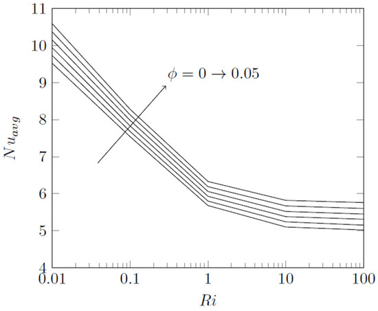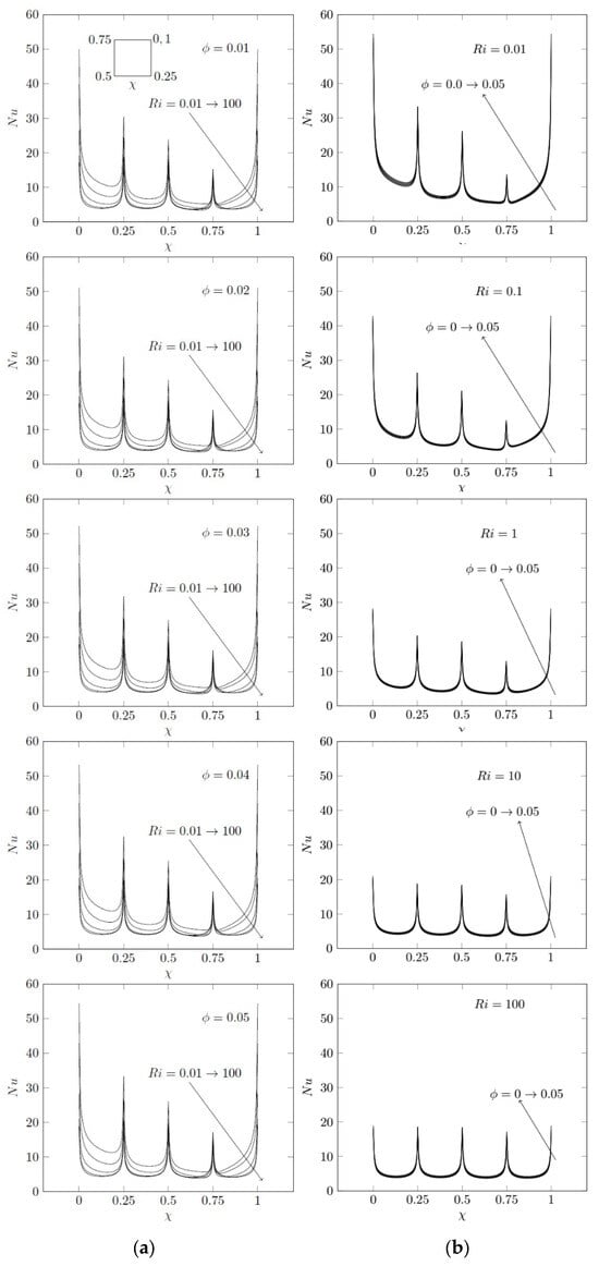 The numerical calculations were conducted for a constant Grashof number (Gr) of 100. The Richardson number (Ri) was varied within the range of 0.01 to 100, while the nanofluid particle range (ϕ) was set from 0 to 0.05. The Richardson number is defined as the ratio of Grashof number to the square of the Reynolds number (Ri = Gr/Re2).