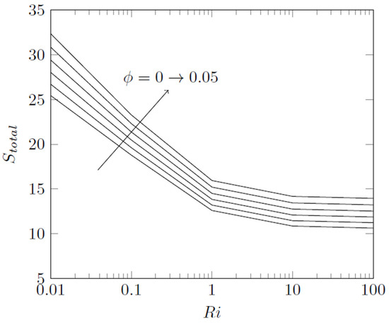 Total dimensionless entropy for ϕ = 0.01–0.05 and Ri = 0.01–100.