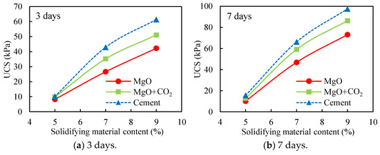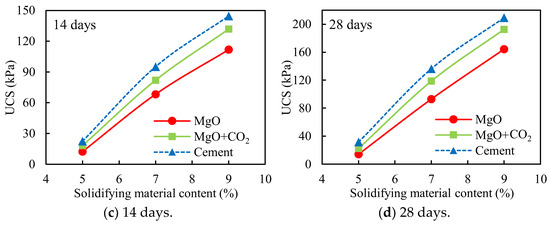 - The UCS of MgO-solidified silt increased with the MgO content and curing time. The UCS of the solidified silt with a MgO content of 9% and curing time of 14 d reached 111 kPa. A longer curing time resulted in a more significant effect of the MgO content, and a higher MgO content resulted in a more notable effect of curing time on the UCS.