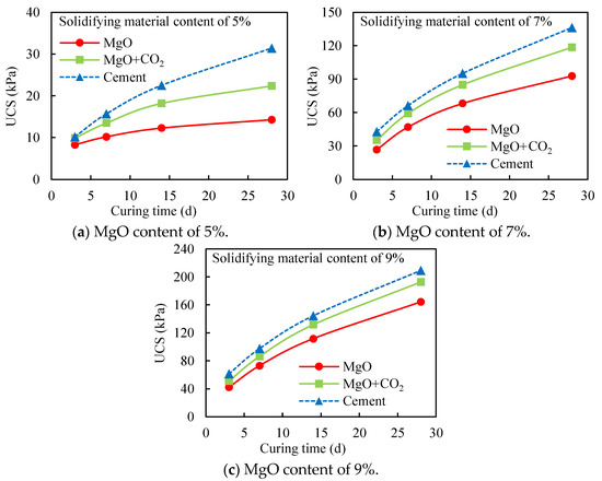 Figure 3 shows the effect of curing time on the UCS of the solidified silt. For curing times from 3 to 28 d, the UCS of solidified silt with MgO contents of 5%, 7%, and 9% increased from 8.3, 26.6, and 42.2 kPa to 14.3, 92.9, and 164.2 kPa, respectively, representing increases of 72.29%, 249.3%, and 289.1%, respectively. This result indicates that higher MgO content resulted in a more significant effect of curing time on the UCS of the solidified silt. Moreover, the UCS increased more rapidly in the early stages of curing and then slowed down: for curing times from 3 to 14 d, the UCS of the solidified silt increased by 48.19%, 156.4%, and 164.4% for MgO contents of 5%, 7%, and 9%, respectively, compared with increases of 16.26%, 36.22%, and 47.00% for the curing period from 14 to 28 d, respectively.