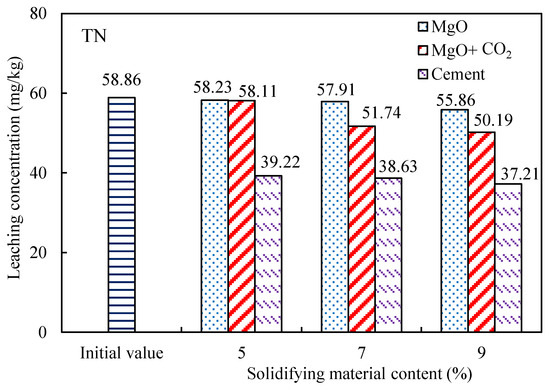 Figure 4, Figure 5, Figure 6, Figure 7 and Figure 8 show the leaching concentrations of nutrient salts (TN and TP) and heavy metal pollutants (Cu, Cr, and Ni) in the dredged silt following the different treatment methods. Figure 4 shows that the TN concentrations in the leached MgO-solidified silt with MgO contents of 5%, 7%, and 9% were 58.23, 57.91, and 55.86 mg/kg, respectively. Higher MgO content resulted in a lower leaching concentration. Compared with the as-received silt sample, the TN leaching concentrations decreased by 1.07%, 1.61%, and 5.10%, respectively, but were still 33% higher than those of cement-solidified silt with the same additive content. Following the CO2 injection, the TN leaching concentrations of the MgO-solidified silts were further reduced by 0.21%, 10.65%, and 10.15%, respectively, which was approximately 28% higher than the equivalent values for the cement-solidified silts.