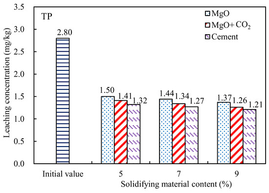 Figure 5 shows that the effect of MgO on the TP leaching concentration was much more significant than that of TN. The TP concentrations of the leached solidified silts with MgO contents of 5%, 7%, and 9% were 1.50, 1.44, and 1.37 mg/kg, respectively. These values were, respectively, 46.43%, 48.57%, and 51.07% lower than those of the as-received silt sample but 11.8% higher than those of the cement-solidified silts. The TP concentrations of the leached MgO-solidified silts with the CO2 injection were, respectively, 6.00%, 6.94%, and 8.03% lower than those without the CO2 injection, which was approximately 5% points higher than those of the cement-solidified silt.