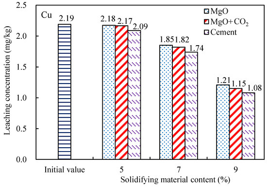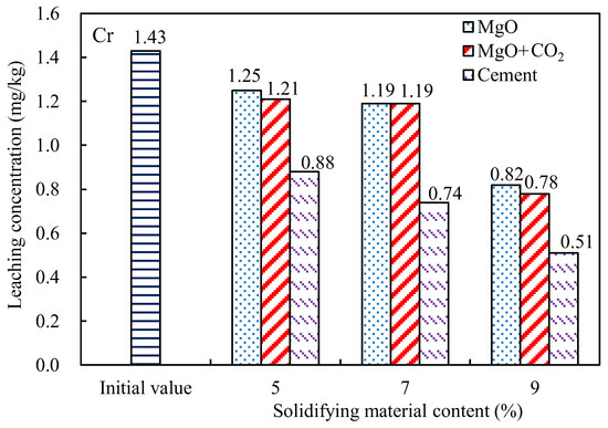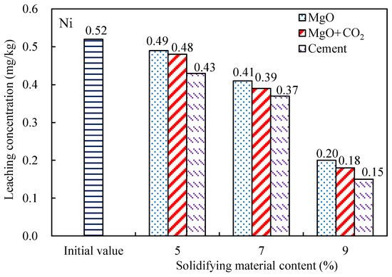 Figure 6, Figure 7 and Figure 8 show that the variations in the leaching concentrations of Cu, Cr, and Ni were similar to those of TN and TP and decreased with increasing MgO content. Compared with the as-received silt sample, the concentrations of Cu, Cr, and Ni in the leached solidified silts with MgO contents of 5%, 7%, and 9% with the CO2 injection decreased by 1.09–47.54%, 7.69–65.38%, and 15.38–45.45%, which were 4.7%, 10.7%, and 33.3% higher than those of the respective cement-solidified silts. MgO solidification with the CO2 injection had the most significant impact on the leaching of Ni, with a reduction in the Ni leaching concentration of more than 65%, but the values for Cu leaching from the MgO-solidified silt were closest to those of the cement-solidified silt.