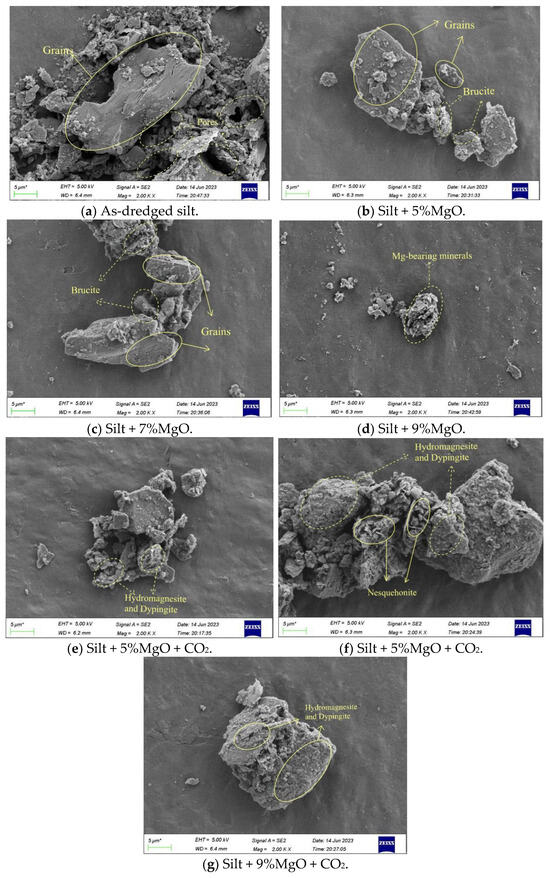 The as-dredged silt and MgO-solidified silts with and without a CO2 injection with different MgO contents were examined by SEM to reveal the mechanism of MgO solidification and CO2 carbonization. Figure 9 shows the respective SEM images. Figure 9a shows that connections between the as-received silt particles were relatively loose and the particles had obvious pores. In the MgO-solidified silt samples without a CO2 injection (Figure 9b–d), obvious flocculated material filled the surface pores. This was identified as brucite (Mg(OH)2) that had been generated by the MgO addition. As the MgO content increased, the pore size significantly reduced and the pores were gradually filled. The strength of the silt after solidification with MgO was therefore enhanced. In the SEM image of the silt solidified with 5% MgO with a CO2 injection, the silt had clear edges and boundaries, and its surface was attached to thin sheet-like materials. These were identified as hydromagnesite (Mg5(CO3)4(OH)2·4H2O) and dypingite (Mg5(CO3)4(OH)2·5H2O) that were produced by carbonization. With an increase in the MgO content, the silt boundaries gradually blurred, the pores were progressively refined, and an increase in the amount of flake-like cementing material was observed on the silt surface. When the MgO content was 9%, the silt pores were almost completely filled and the surface was covered by flake-like and prismatic material (nesquehonite (MgCO3·3H2O)), which showed an overall dense block structure. Although the pores of the solidified silt without the CO2 injection were almost filled, the filling was relatively loose: the structure of the MgO-solidified silt with the CO2 injection was denser, and cementation between the silt particles was stronger.