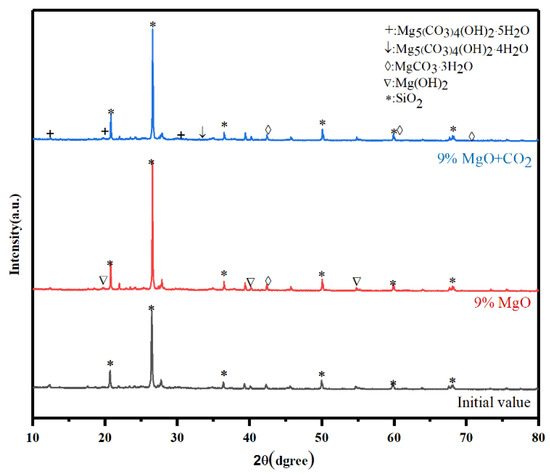 Figure 10 shows the XRD patterns of the as-dredged silt and MgO-solidified silts with and without a CO2 injection. It can be seen that the as-dredged silt was mainly composed of quartz (SiO2). The MgO-solidified silt mainly contained compounds of silicon, aluminum, magnesium, and calcium. Except for the original quartz in the as-dredged silt, the main phase was Mg(OH)2. The diffraction peaks of MgO are hardly seen in the figure, indicating that the hydration reaction of MgO was basically completed. With the CO2 injection, the diffraction peaks of Mg(OH)2 gradually disappeared and a large number of MgCO3·3H2O, Mg5(CO3)4(OH)2·4H2O, and Mg5(CO3)4(OH)2·5H2O appeared, which are the products of the full carbonization of Mg(OH)2. This also indicates that MgCO3·3H2O, Mg5(CO3)4(OH)2·4H2O, and Mg5(CO3)4(OH)2·5H2O were the main carbonation products and facilitated the strength growth of MgO-solidified silt with the CO2 injection.