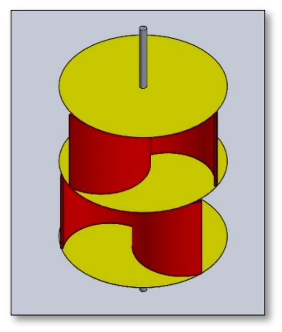 A multi-stage rotor involves stacking similar turbine units (stages) on the same shaft, one above the other, with specific orientation phase angles. This arrangement, as depicted in Figure 9, aims to address the performance limitations of the conventional Savonius rotor. Torque fluctuations significantly impact the conventional rotor’s performance. However, by utilizing a multi-stage configuration, these fluctuations can be smoothed out, resulting in stabilized static torque without sacrificing overall performance [52,53]. Numerous research studies have explored how altering the number of stages impacts rotor performance. Frikha et al. (2016) [54], in their study, found that the dynamic torque coefficient rises as the number of stages increases. In their study, Mahmoud et al. (2012) [47] found that a multi-stage rotor provides higher specific power compared to a single-stage rotor. On the other hand, Jian et al. (2012) [55] discovered that the coefficient of power for a one-stage rotor was approximately 20% higher than that of a multi-stage rotor. This difference could be attributed to the influence of endplate design and aspect ratio values. In their study, Kamoji et al. (2008) [56] investigated the coefficient of power and the coefficient of torque variation in a multi-stage Savonius wind rotor. Surprisingly, the two-stage and three-stage Savonius rotors exhibited similar performance with the same Reynolds number and aspect ratio. However, the three-stage rotor outperformed the two-stage rotor in terms of static torque, as illustrated in Figure 10.