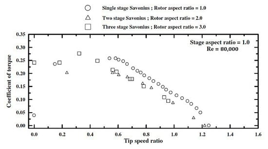 Torque coefficient against TSR for single-, two- and three-stage Savonius rotors [56].