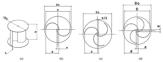 Savonius rotors with various blade numbers: (a) isometric 3D view of the two blades rotor; (b) two-blades rotor; (c) three blades rotor; (d) four blades rotor [63].