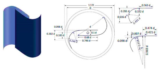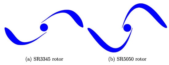 Roy and Saha (2015) [74] examined a modified Bach-type blade. The newly developed blade profile demonstrated a substantial 34.8% improvement in the maximum power coefficient. This enhancement was achieved by altering the blade’s arc shape, allowing the novel rotor to counteract negative torque and increase the static torque coefficient. Kacprzak et al. (2013) [75] explored semi-elliptical blades. These blades featured a novel design, as depicted in Figure 17. The results demonstrated a significant 9.6% improvement in the power coefficient compared to the conventional blade profile. An elliptical Savonius wind turbine blade closely resembles the semicircular blade but has a slightly elongated rear end, creating the appearance of being connected in the middle. Researchers have proposed and experimentally evaluated the efficiency of elliptical blades as an alternative shape for wind turbine blades [89]. Kacprzak et al. (2013) [75] employed elliptical blades. These blades were used to highlight the performance differences when compared to other blade shapes. Specifically, the elliptical blade design demonstrated notable improvements in terms of power coefficient, outperforming conventional blade profiles. The research sheds light on the potential benefits of using elliptical blades in wind turbine applications [90]. With a view to enhancing the performance of the Savonius turbine, Tartuferi et al. (2015) [91] developed novel rotor geometries known as the SR3345 rotor and the SR5050 rotor (illustrated in Figure 18). These innovative designs involve modifications to the section curvature. The primary objective was to reduce the pressure behind the advancing blade, resulting in more favorable rotation. The study conclusively affirmed that adopting such geometries holds great promise for boosting the overall performance of Savonius rotors.