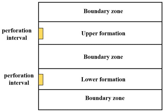 A 2-D CZM model combined with user-defined perforation elements was developed to investigate the complex fracture mechanisms of hydraulic fracturing in multi-layered formations. The same simulation steps were applied for each case considered. In general, there are four necessary steps. The geostatic equilibrium between the initial loads (stresses and pore pressure) and the boundary conditions should be set, which is called Geostatic step. In addition, the initial loads can be applied programming subroutines, which are match with the actual in-situ stress environment. In the second step, defined as consolidation analysis, a non-Newtonian fluid is injected at a given flow rate to investigate the influence of fracture fluid viscosity on hydraulic fracture growth. In the third steps, a temporary plugging agent mixed with the proppant is injected. At this stage, due to the filter cake, fluid pressure is not allowed to be transmitted to the tip of the crack, so it reduces fluid pressure transmission within each crack and increases pressure in the wellbore. In the fourth step, inject fracturing fluid again and observe crack propagation. No confining stresses and reservoir pressure are applied to the formation, and the outer normal displacement and pore pressure are fixed to zero during the entire process. Figure 3 shows the schematic of hydraulic fracture propagation for multilayer zones at the unconsolidated formation. The size of the model is 55 m × 100 m. The target formation is composed of five zones, and two pay zones are set, which are upper formation and lower formation. This study used a nonlinear FEM equation solver ABAQUS to solve the fracture initiation and propagation equations. The C3D8P element, which has three displacement nodes and eight seepage nodes, incorporates the equations for matrix seepage and rock deformation. The cohesive zone element COH3D4P, which has a pore pressure degree of freedom, is coupled to the fracture initiation and propagation equations to simulate the fracture propagation. The three-dimensional fluid pipe elements with two pore-pressure nodes FPC3D2 have the fluid distribution equations between many fractures coded into them. It should be noted that C3D8P: A three-dimensional porous elastic element used for the analysis of permeability and structural interactions. The FPC3D2 unit embeds a main unit with both translational and pore pressure degrees of freedom, and only the pore pressure degrees of freedom shared by the embedded unit nodes will be constrained. COH3D4P is a cohesive unit. The finite element framework may perform automatic computations by combining all these components into a single integrated model. In fact, this simulation is based on the treatment of ultra static water pressure, and the pore pressure boundary is defined as 0. The initial stress and pore stress of the second step are automatically balanced by the model after the geostress is balanced, without any additional settings. The input information for the simulation of hydraulic fracturing in multilayer zones for the unconsolidated formation is provided in Table 1. The input data for the numerical model are all from on-site actual relevant data and indoor experimental data [27]. As shown in Figure 4, the distribution diagram of the cohesive force unit nodes in the model. The model size is 120 × 80 m.