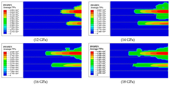 In order to quantify the effect of Young’s modulus for the pay zone in different depths of limited entry fracturing, we compared the geometry in multilayered fracturing in Figure 5. We study the effect of Young’s modulus on crack propagation by changing the magnitude of the Young’s modulus in the production layer in Figure 6. The color contours represent the fracture width for each figure. It shows that the increase of Young’s modulus can increase the fracture length for each pay zone. The fracture length in both two pay zones increase to far extent. That’s because the increase of the Young’s modulus increases the formation brittleness. The increase in rock brittleness index increases the fracture propagation capability. It can be seen that the fracture length increases more rapidly with the Young’s modulus of the rock before 14 GPa, and the fracture length of the upper reservoir increases nearly 15 m between 12 GPa and 14 GPa. In the contrary, from the simulation results of the fracture width under different conditions, it can be obtained that the fracture width decreases more before 14 GPa. For example, in the upper reservoir, the fracture width decreases from about 5.54 mm to 4.53 mm. The reason for this is that the increase in elastic modulus makes the reservoir denser and more brittle, leading to the rapid expansion of the main fracturing fracture once it forms, resulting in a decrease in the expansion in the width direction.
