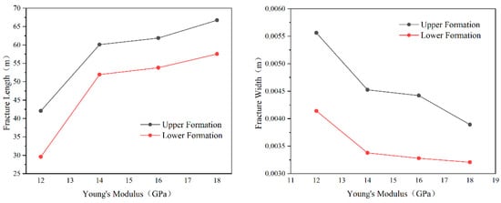 Relationship between Young’s modulus with fracture length and width under fracturing of separate layers.