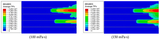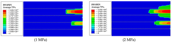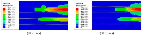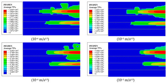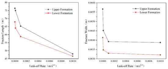 In order to quantify the effect of flow leak-off rate in different depths of limited entry fracturing, we compared the geometry in multilayered fracturing in Figure 7. The color contours represent the fracture width for each figure. From the hydraulic fracturing simulation results, it can be seen that when the formation fluid leak-off rate increases, the fracture width and fracture length are undergoing a significant decrease. In the upper reservoir, when the fluid leak-off rate ranges from 10−6 m/s0.5 to 10−4 m/s0.5, the width of the fracture decreases abruptly from about 5.55 mm to about 4 mm, and when the fluid leak-off rate is larger than 10−4 m/s0.5, the fracture width does not decrease significantly. Fracture length in 10−4 m/s0.5 at the same rate of decline rate inflection point, but the fracture length will continue to decrease because of the increase in the fluid leak-off rate. From Figure 8, it can be seen that the increase of the fluid leak-off rate will cause a large amount of fracturing fluid to be lost into the formation, and the fracturing fluid will be present in a large amount in the near-well formation around the wellbore, and the energy of fracture initiation and expansion can not be maintained, which not only seriously affects the reservoir stimulation effect, but also possibly induce formation damage. The reason for this is that the greater the fluid leakage rate, the more severe the fracturing fluid loss, ultimately leading to a decrease in both crack length and width, which is not conducive to fracturing operations.