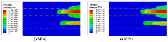The direction of the current maximum horizontal stress affects the direction of hydraulic fracturing and influences fracture geometry. The color contours represent the fracture width, see Figure 11. The magnitude of the in situ stress can be determined by leak-off test, and the orientation of the maximum horizontal stress can be determined by resistivity image logging to determine the distribution and change in the depth and lateral directions. The change of crack morphology with stress difference is simulated for interlayer stress differences of 1 MPa, 2 MPa, 3 MPa, and 4 MPa, and the change of hydraulic fractures with in situ horizontal stress difference is shown in Figure 12. The numerical simulation results show that the fracture length increases linearly with increasing interlaminar stress. When the stress difference increases from 1 MPa to 4 MPa, the fracture length increases from 35.3 m to 48.2 m. The crack width does not change with respect to the in situ stress difference. Since the crack initiation zone tends to originate from the low stress location, the increase in stress difference limits crack propagation in the target zone.